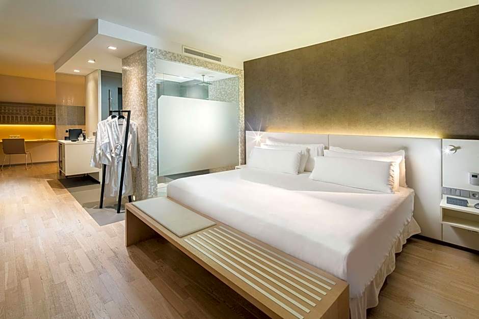 Modern suite with stylish furniture, flat-screen TV and complimentary toiletries in the private bathroom.